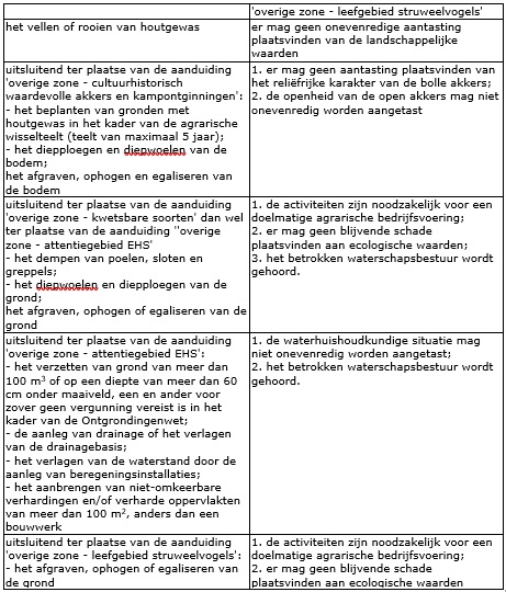 - het aanleggen van wegen of paden en het aanbrengen van andere oppervlakteverhardingen; - het verlagen van de grondwaterstand door aanleg van drainage of bemaling; - het aanleggen, dempen of wijzigen van oppervlaktewateren; - het wijzigen van het maaiveldniveau door ontgronding of ophoging; - het aanbrengen of wijzigen van kaden. door de genoemde werken en werkzaamheden mag geen onevenredige afbreuk worden gedaan aan het behoud, herstel en/of de ontwikkeling van het waterbergend vermogen van de gronden. | door de genoemde werken en werkzaamheden mag geen onevenredige afbreuk worden gedaan aan het behoud, herstel en/of de ontwikkeling van het waterbergend vermogen van de gronden. Dienaangaande vraagt bevoegd gezag advies van het waterschap. |