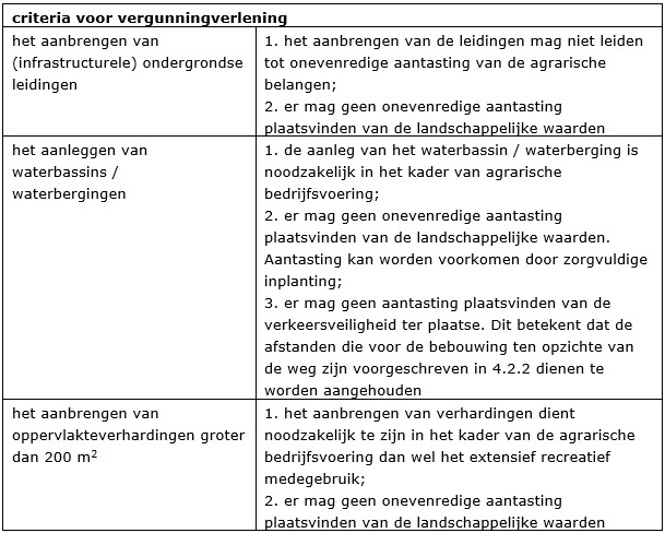 - hoog/ tijdelijk: teeltondersteunende voorzieningen met een hoogte van minimaal 1,5 m, uitsluitend toegestaan zolang de teelt het vereist met een maximum van 6 maanden, bijvoorbeeld menstoegankelijke wandelkappen, schaduwhallen en hagelnetten;